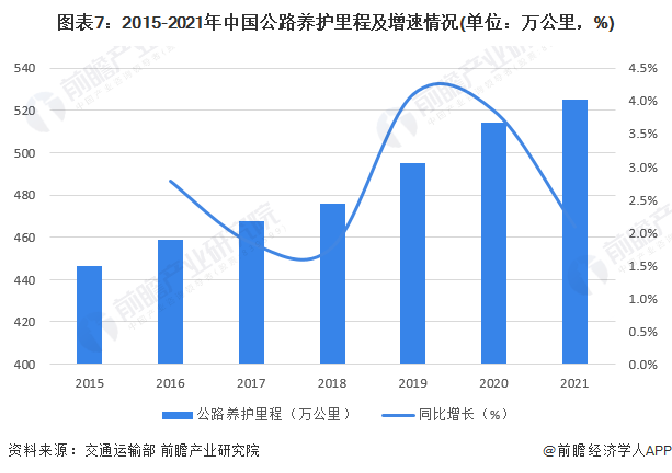目前,中国公路网络建设日渐完善,大规模建设后必然带来繁重的养护任务,公路养护已由传统的“抢修时代”过渡到“全面养护时代”。根据交通运输部数据,2015-2021年,中国公路养护里程逐年增长,截至2021年末,中国公路养护里程超过520万公里。