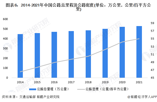 2014-2021年,中国公路总里程及公路密度逐年上升。截至2021年末,全国公路总里程超过520万公里,比2020年末增加8.26万公里;公路密度超过55公里/百平方公里,同比2020年末增加0.86公里/百平方公里。我国公路基础设施里程建设不断增加,对公路养护服务需求也日益增长。
