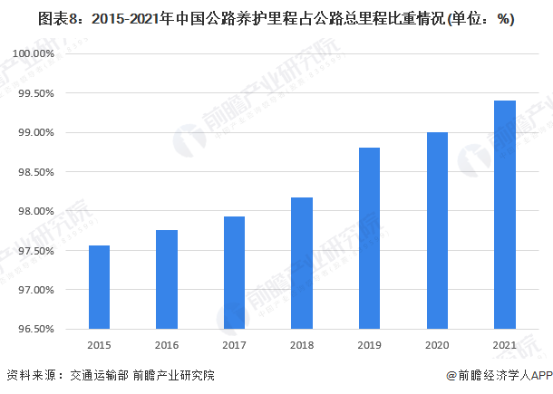 从公路养护里程占公路总里程比重来看,2015-2021年呈现逐年上升态势,2021年占比已经超过99%。