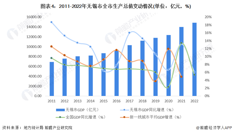 从统计数据来看,2022年无锡市GDP达到1.49万亿元,同比增长6.05%。对比来看,无锡市GDP增速在2011-2022年基本维持在全国GDP同比增速和新一线城市平均增速水平之上,发展相对较好。