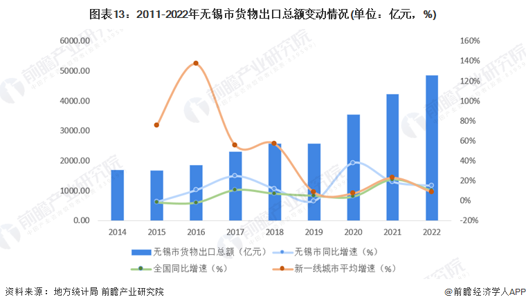 总体来看,2011-2022年无锡市货物出口额呈现波动上升趋势,2022年无锡市总体出口规模近5000亿元,同比上升14.94%。对比全国货物出口增速和新一线城市平均增速来看,2011-2022年无锡市出口增速与全国平均水平变动趋势相对较为一致,其货物出口额增速周期性变动趋势明显。