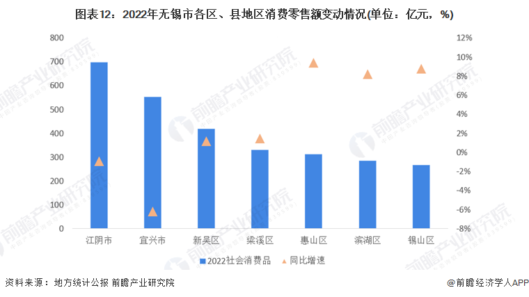 从各区域统计公报来看,2022年无锡市各区中,江阴市消费品零售额规模最大,2022年达到近700亿元,2022年无锡市各区县中惠山区、锡山区和滨湖区全社会消费品增速最快。