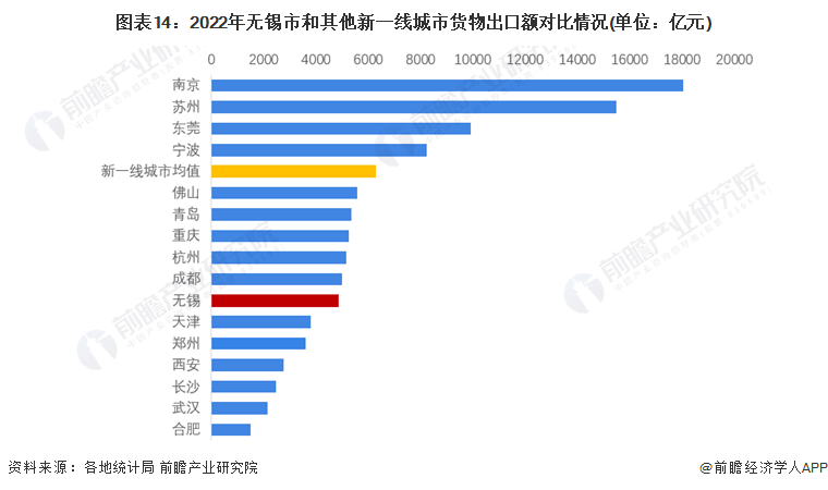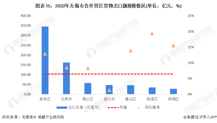 从无锡市公布数据来看,2022年无锡市各外贸区出口规模均值为727.88亿元,新吴区和江阴市的出口规模总体高于均值,其中新吴区2022年货物出口额规模最大,梁溪区增速最快。