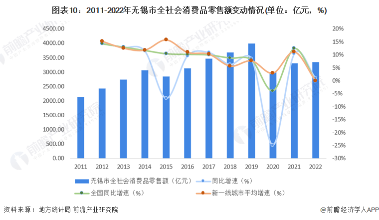 无锡市全社会消费品零售额在2011-2019年呈现上升趋势,2020年受疫情影响有所下降。从全社会消费品零收额变动速度来看,2011-2022年无锡市全社会消费品零售额变动趋势和全国同比增速、新一线城市平均增速变动趋势基本保持一致。