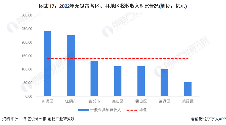 从2022年各区县统计公报来看,2022年无锡市各区的税收收入均值为139.81亿元,各市区中有2大市区的税收收入高于均值,其中新吴区的税收收入规模最大,2022年达到242.06亿元,其次为江阴市,其2022年税收规模226.83亿元。