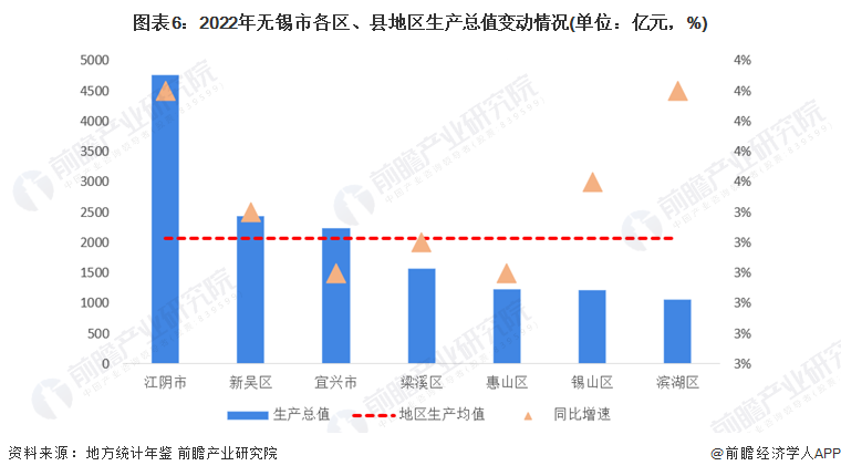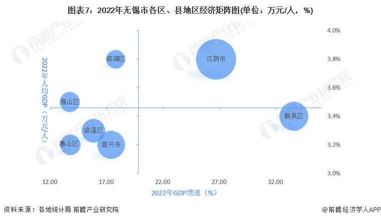 (2)各区县情况:江阴市GDP最高,滨湖区GDP增速最快