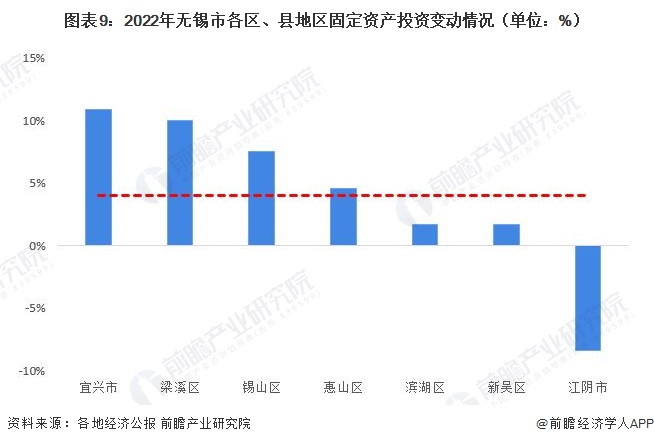 根据2022年各地经济公报,宜兴市2022年固定资产投资增速最快,达到10.9%,其次为梁溪区,2022年梁溪区固定资产投资增速达到10%。同时2022年无锡市锡山区的固定资产投资增速也超过了5%。