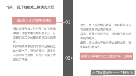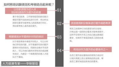 在给企业做咨询的过程中,我们发现很多企业都存在这样的困惑:如何将培训跟绩效和晋升联系、挂钩。企业往往投入了不少的成本来开展培训、考核或者建设晋升体系,但是由于每项工作都是独立开展,没有形成一个体系化的运作方式,结合不紧密,使得各项工作没有发挥最大的作用。华恒智信在多年专注人力资源咨询的经验中发现,企业往往将这三个部分割裂开来,单独推进,造成了很大的资源浪费。所以,如果企业能够把培训、晋升和绩效考核紧密结合起来,作为一个系统工程来开展工作,就能够实现资源利用更充分、人才管理更科学。那么在面对这样的问题的时候,企业应该怎么做呢?我们提出,首先要了解到这几个模块之间的关联方面的注意点。