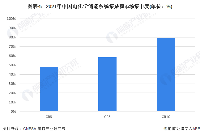 从电化学储能系统集成商的市场集中度来看,2021年,中国电化学储能行业CR3达到48%,CR5为58.2%,CR10超过75%。整体来看,中国电化学储能行业市场集中度较高。