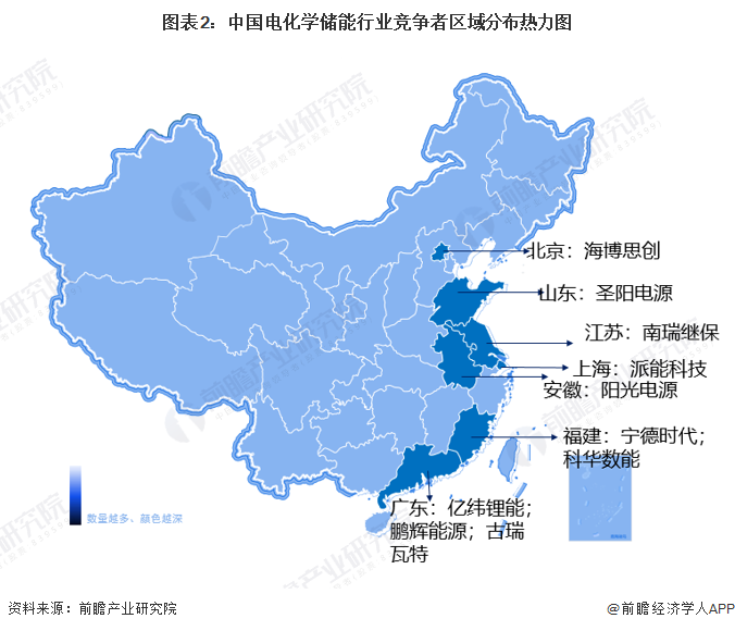 中国电化学储能行业企业主要分布在沿海地区,例如广东有亿纬锂能、古瑞瓦特、鹏辉能源等企业,福建有宁德时代与科华数能。