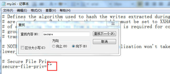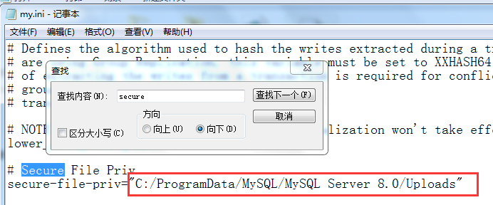 用记事本方式或者notepad++打开C:\ProgramData\MySQL\MySQL Server 8.0下面的my.ini文件,我们搜索secure(注意不要搜secure_file_priv,否则你搜不到),搜索结果如下: