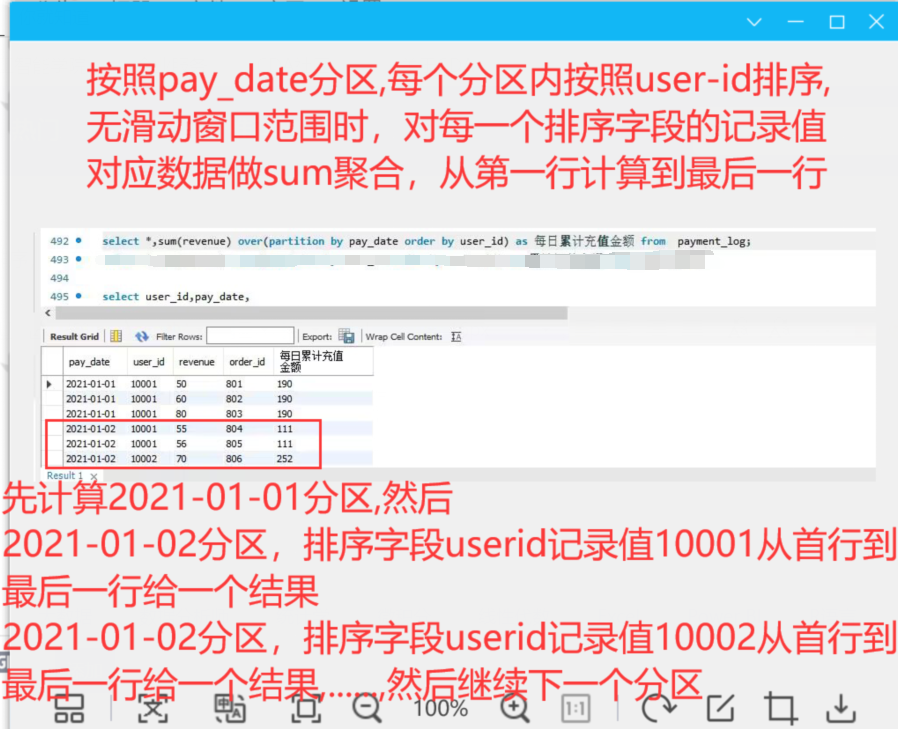 #2, 在同一个分区下,排序字段记录值相同时,不累加,这些记录行会给同一个聚合值, 到新的排序字段记录值出现时,会自动累加上一个聚合值.