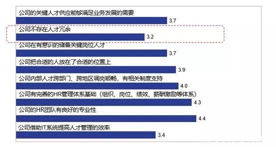 3. 人才供应链管理成熟度(TMI)略低,评分只有3.8分,表明当前L企业的人才供应无法及时地满足发展的需求。结合总体评价维度的题目来看,L企业的HR团队有比较好的专业性,得到了大家认可,且管理体系也是比较让人满意的。L企业在人才供应链中最突出的问题是人才冗余,其次是没有选用适合的IT系统来提高人才管理的效率。