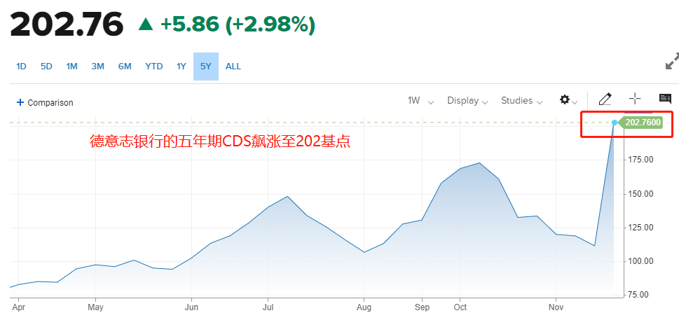 ATFX国际:3月24日德意志银行的5年期信用违约互换CDS冲上208基点,创下2020年以来最高值,且过去三个交易日大涨66个基点。相比3月14日,瑞士信贷一年期CDS飙涨至800基点以上,德意志银行的信贷违约风险相对偏低。在欧美银行业不断暴雷的背景下,股票市场已经是惊弓之鸟。德意志银行股价在本月累计跌幅达到21.34%,股票市场的担忧情绪可见一斑。