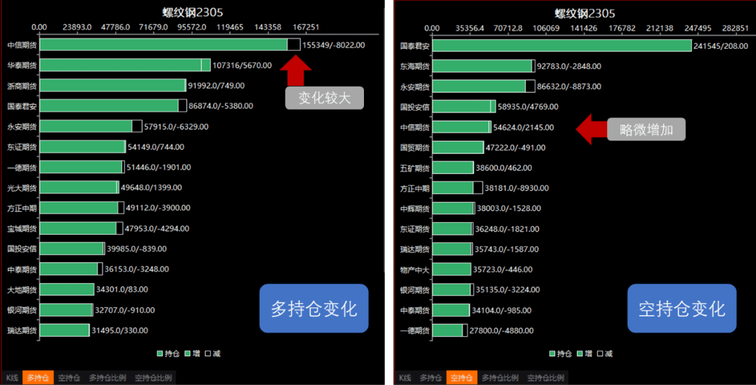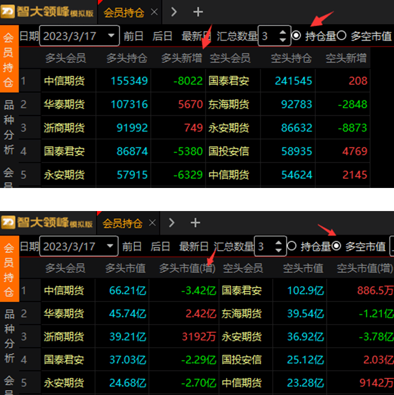 直观的分析是通过柱状图观察当日哪些会员的多单变化大,哪些会员空单变化大。