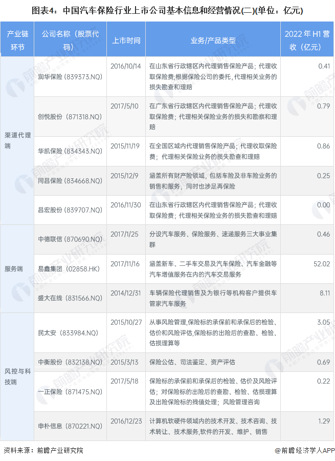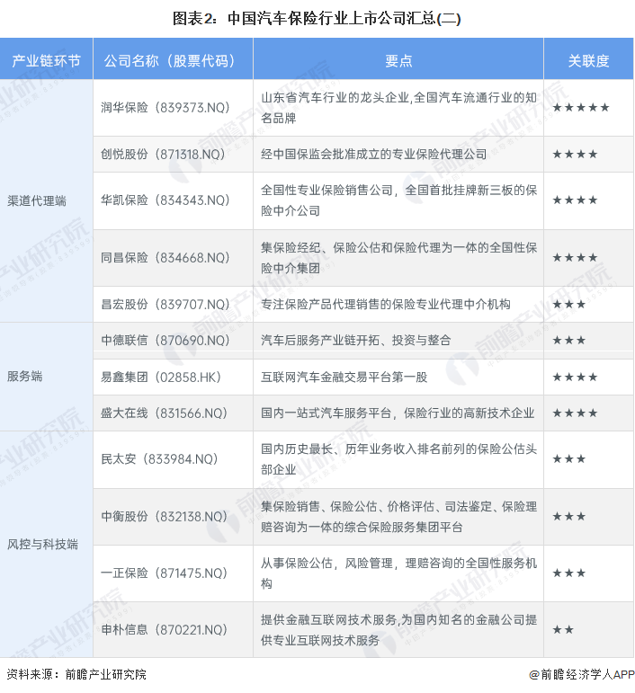 保险行业无论是稳定经营还是企业规模扩张都有着较大的资金需求,上市有利于企业稳定发展,保障现金流的充足,目前,保险行业规模增速放缓,投资者对保险企业保留观望态度,且大多数保险企业难以满足上市首发条件,因此我国保险行业上市企业数量较少。汽车保险行业方面,除保险公司外,还有大量的保险代理、保险服务理赔、保险风控等机构,但大多企业选择新三板挂牌或港股上市,具体企业汇总如下: