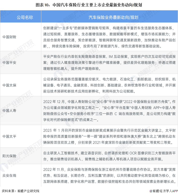 从企业最新业务动向或规划来看,各保险企业紧跟保险行业数字化、智能化的发展趋势,积极进行技术开发和创新,将新一代信息技术与业务发展融合,利用科技赋能企业发展。如中国人寿财险数字化创新产品“安心享”平台获奖;众安保险和浙商保险合作构建互联网和数字化运营体系。