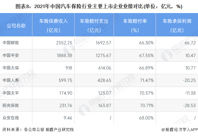从业务布局来看,汽车保险是财产保险中的主要险种,除众安在线,其余企业车险业务占比均超过50%;区域布局方面,中国上市险企均在全国范围布局,设立相关机构;众安在线为互联网平台,故无线下机构,车险业务线下活动较为频繁,线上开展服务存在一定局限性,因此众安在线车险业务占比仅为5%。