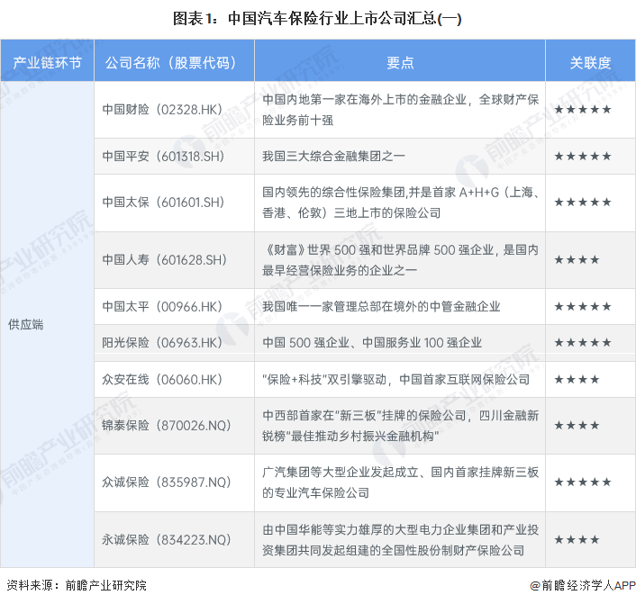 供应端:中国财险(02328.HK)、中国平安(601318.SH)、中国太保(601601.SH)、中国人寿(601628.SH)、中国太平(00966.HK)、阳光保险(06963.HK)、众安在线(06060.HK)、锦泰保险(870026.NQ)、众诚保险(835987.NQ)、永诚保险(834223.NQ)等;