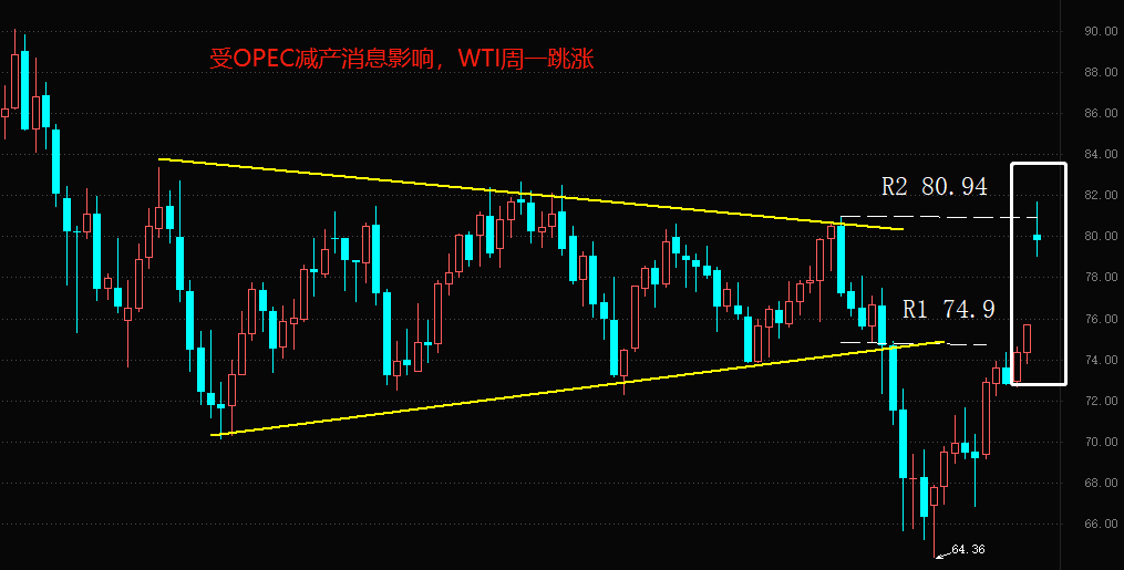 4月2日,有悖于以往在OPEC+部长级会议上宣布减产的消息,多个OPEC+成员国突然宣布实施自愿石油减产,可见产油国对于持续下跌的国际油价倍感焦虑。根据产油国目前宣布的减产数据,此次各产油国减产幅度总和约160万桶/日,占全球石油产量的1.5%左右。沙特阿拉伯表示,从5月开始至2023年年底自愿将原油日产量削减50万桶。阿联酋将减产14.4万桶/天,科威特将减产12.8万桶/天,伊拉克将减产21.1万桶/天,哈萨克斯坦将减产7.7万桶/日,阿曼将减产4万桶/天,阿尔及利亚将减产4.8万桶/天。早在今年3月24日,俄罗斯副总理诺瓦克对外宣称,俄罗斯非常接近于实现将原油产量减少50万桶/日的目标,达到约950万桶/日。俄罗斯与OPEC减产的叠加效果,导致全球市场每天减少200多万桶的供应。国际油价应声上涨:WTI跳涨开盘,盘中最高触及81.69美元/每桶,截至今日16:30,WTI上涨5.92%至80.12美元/桶,关于油价大涨的消息冲上各大财经网站头条。不过,就像我们前面所说的,供应的减少只能暂时稳住价格,如果需求面不改善,市场消化了减产预期之后,WTI还将进一步下跌。