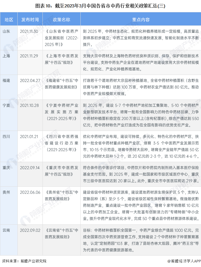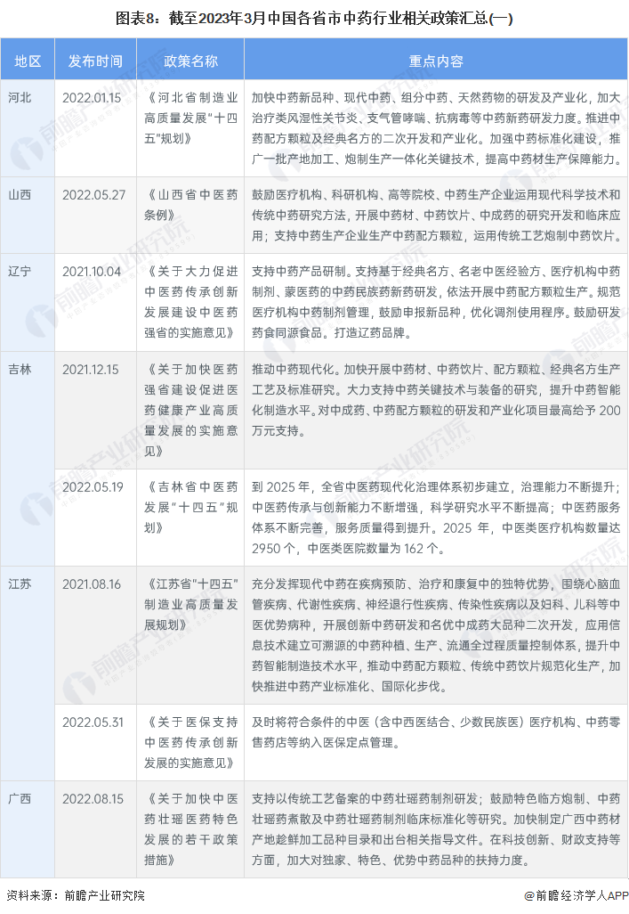 除国家政策外,各省市也纷纷发布本省关于中药领域的相关政策或者是规划,部分省市中药领域相关政策或规划汇总如下: