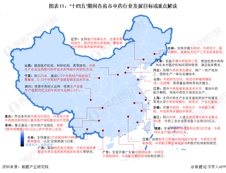各省纷纷出台了“十四五”期间中医药发展规划,并提出中药行业发展重点。如吉林、安徽、江西、广东等地提出加快制定并完善中药材、中药饮片等产品标准体系;浙江、福建、贵州等对中药行业产值和企业营收提出量化目标。