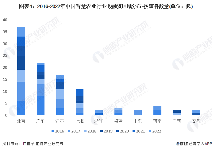 从中国智慧农业行业的企业融资区域来看,目前北京智慧农业相关的企业融资活动最多,2016-2022年累计达到37起;其次为广东和江苏地区,分别累计发生投融资事件22起17起。