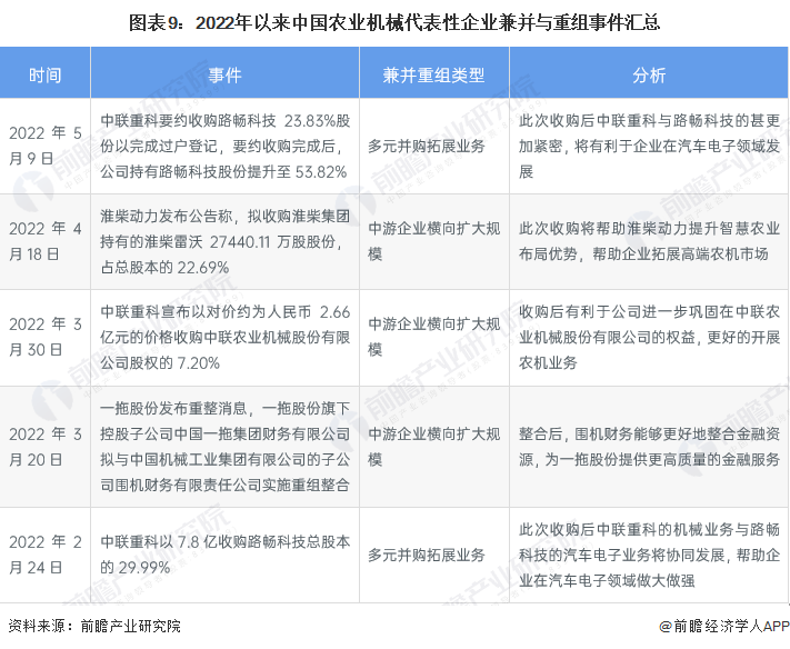 以农业机械为例,农业机械领域在我国仍处于发展期,众多企业仍以发展主营业务为主,因此并购重组事件的主要目的是横向并购扩大规模,除此以外,中联重科等企业也通过并购拓展其他领域的业务,为企业发展注入新的活力。2022年以来中国农业机械代表性企业兼并与重组事件汇总如下: