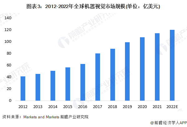 机器视觉的优势是显而易见的,与人眼相比,机器不仅不会疲劳,具有人所不具有的一致性和重复性,而且机器可以看到和使用可见光以外的其它光源信息。检测速度和精确性也是机器视觉检测具备的一个明显优势。消费电子、半导体、包装、食品等一系列行业对工业自动化的需求推动了机器视觉行业的增长。根据国外调研机构Markets and Markets的数据,2012-2022年,全球机器视觉市场规模呈现不断上升的趋势。2021年,全球机器视觉市场规模达114亿美元;2022年,全球机器视觉市场将继续保持增长,市场规模达120亿美元。