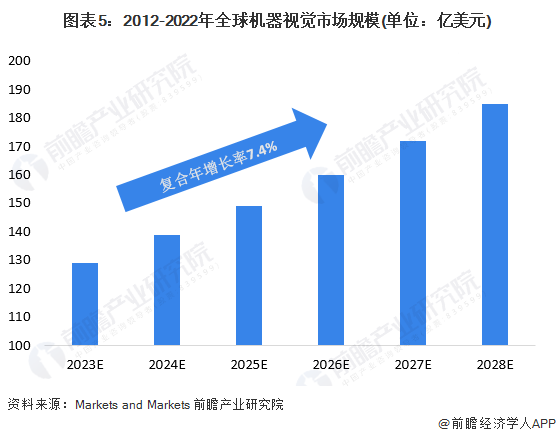 现代工业自动化技术日趋成熟,越来越多的制造企业考虑如何采用机器视觉来帮助生产线实现检查、测量和自动识别等功能,以提高效率并降低成本,从而实现生产效益最大化。机器视觉作为新兴技术被寄予厚望,被认为是自动化行业一个具备光明前景的细分市场。据Markets and Markets预测,全球机器视觉市场2022-2027年预测期内的复合年增长率为7.4%,至2027年,全球机器视觉市场规模将达到172亿美元。前瞻基于全球机器视觉市场规模数据预测,2028年全球机器视觉市场规模将达到185亿美元。