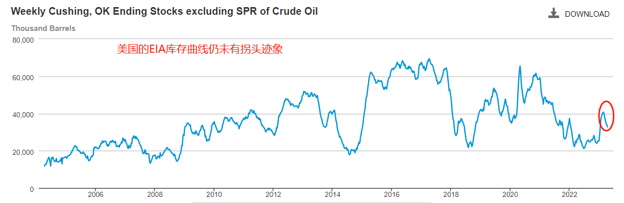 虽然黄金和原油价格都在下跌,但两者的趋势方向是不同的。黄金的下跌具有短期属性,因为中长期震荡区间已经在3月份被突破,未来回踩到位后继续上涨的潜力依旧很大。原油则不然,2022年6月份已经形成双顶结构,跌势已经持续10月有余,看空力量主导行情走势。OPEC减产虽然是利多因素,但只出现了一次,独木难支,无法对中长期走势形成持续影响。