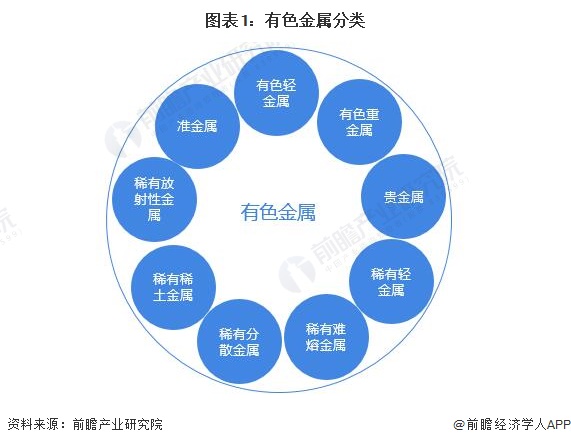 有色金属是指除了铁、铬、锰之外的所有金属,依据有色金属自身属性以及其下游用途,可以划分为有色轻金属、有色重金属、贵金属、稀有轻金属、稀有难熔金属、稀有分散金属、稀有稀土金属、准金属以及稀有放射性金属。