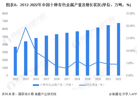 近十年来,我国有色金属行业产量逐年稳定增长。根据国家统计局,2022年我国前十种有色金属产量为6774.3万吨,同比增长4.59%。其中,氧化铝产量8186.2万吨,同比增长5.6%;铜材产量2286.5万吨,同比增长5.7%。2022年,中国规模以上有色金属企业工业增加值同比2增加5.2%,增幅相比全活工业增加值增幅高1.4个百分点。