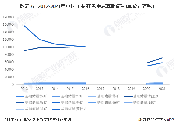 我国铝土矿与菱镁矿储量较多。根据国家统计局,我国已探明基础储量的矿山中,铝土矿与菱镁矿储量较多。截至2021年,我国铝土矿基础储量为7.1亿吨、菱镁矿基础储量为5.8亿吨。其他基础储量相对较多的有色金属矿产和储量分别为铜3494.8万吨、铅2040.8万吨、锌4422.9万吨。