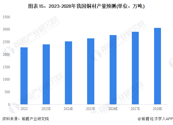 根据我国前十有色金属产量及我国主要有色金属基础储量,前瞻预期未来我国有色金属产量将持续稳定上行,其中,铜、铝两大有色金属产量也将逐年上升。根据预测,2028年我国十种有色金属产量为8637万吨,CAGR5=4.06%;我国铜材产量为3604万吨,CAGR5=5.00%;我国氧化铝产量为11373万吨,CAGR5=5.64%。
