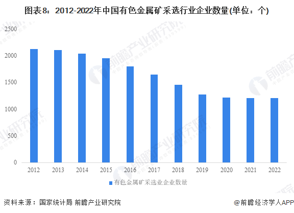 我国有色金属行业企业数量逐年减少。根据国家统计局,2022年我国有色金属矿采选业企业数量为1204个,2012年我国有色金属矿采选业企业数量为2122个,期间减少了918个,占该细分行业原有企业总数的43.3%。由于有色金属矿采选业具有高度资源依赖性,随着区域矿山闭坑以及行业龙头企业不断扩张,行业企业数量减少是必然趋势。