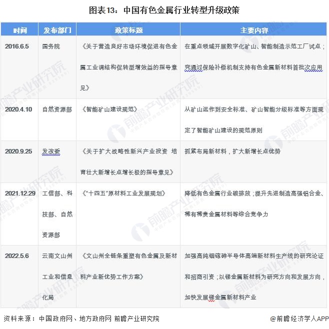 当前,我国有色金属传统采掘、冶炼业务已发展至成熟期,每年已有稳定的矿产产出。结合当前全球发展趋势以及国家规划,我国有色金属行业发展方向逐渐由单一的采掘、冶炼加工、销售模式向新材料生产方向靠拢,同时,企业在经营管理方面也在积极探索智能化、绿色化升级新道路。近年来,国家部委和地方政府均出台多项政策,支持我国有色金属行业向新材料方向进行发展创新、支持企业进行智能化、绿色化升级。