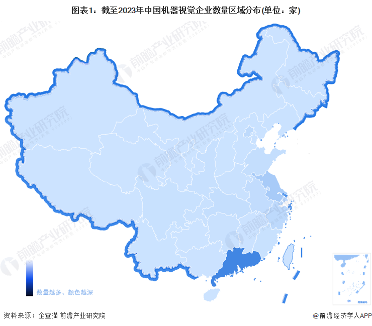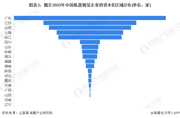 根据中国企业数据库企查猫,目前中国机器视觉企业注册地主要分布在珠三角地区和长三角地区,特别以广东省和江苏省为代表。截至2023年3月15日,广东共有相关机器视觉企业数3495家,江苏则有901家。