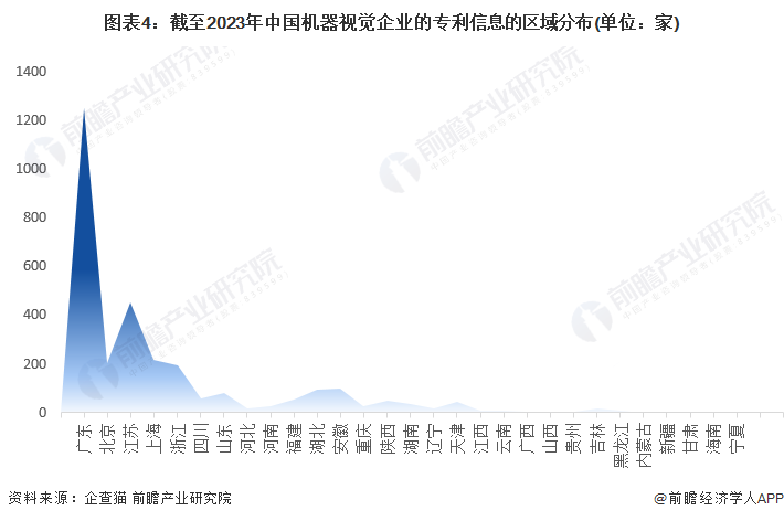 根据中国企业数据库企查猫,目前中国机器视觉有相关专利信息的企业主要分布在广东和江苏等地。截至目前,广东省共有1252家企业拥有专利相关信息,而江苏则有453家企业拥有专利相关信息。