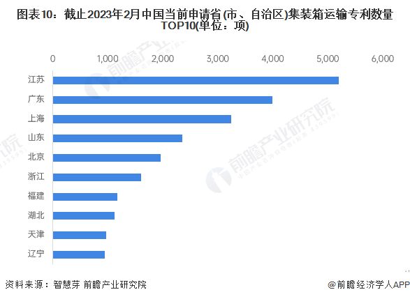 中国方面,江苏为中国当前申请集装箱运输专利数量最多的省份,相关专利申请数量累计超过5000项,其次是广东省的申请量超过3000项。另外,广东、上海、山东三地当前申请集装箱运输专利数量均超过2000项。中国当前申请省(市、自治区)集装箱运输专利数量排名前十的省份还有北京、浙江、福建、湖北、天津和辽宁。