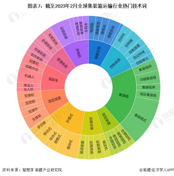 全球集装箱运输前十大热门技术词包括集装箱、控制系统、运输设备、锁定装置、固定装置、装卸车等。进一步细分来看,集装箱运输技术热门词包括海运集装箱、冷藏集装箱、运输系统、框架结构等。具体情况如下: