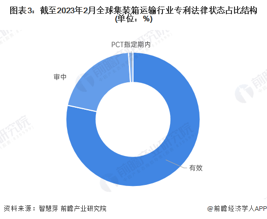 目前,全球集装箱运输行业大多数专利处于“有效”和“审中”状态,其中“有效”状态的集装箱运输专利总量占全球集装箱运输专利总量的比重超70%,而“审中”状态专利量占比超20%。PCT指定期内的集装箱运输专利数量在700项以下,占全球集装箱运输专利总量的1%左右。