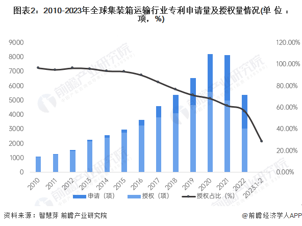 在专利授权方面,2010-2020年全球集装箱运输行业专利授权数量逐年增长,2020年全球集装箱运输行业专利授权数量超过5600项,2022年下降至3000项,授权占比为57%。