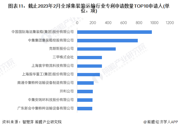 全球集装箱运输行业专利申请数量TOP10申请人分别是中国国际海运集装箱(集团)股份有限公司(即中集集团)、中集集团集装箱控股有限公司(中集集团子公司)、克朗斯股份公司、三甲株式会社、上海寰宇物流科技有限公司、上海振华重工(集团)股份有限公司、南通中集特种运输设备制造有限公司、开利公司、中集安瑞环科技股份有限公司、广东新会中集特种运输设备有限公司。其中有7家中国企业入榜。