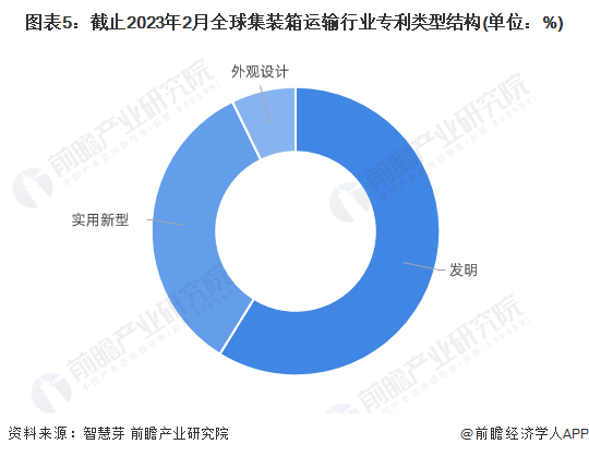 在专利类型方面,目前全球约3.4万项集装箱运输专利为发明专利,占全球集装箱运输专利申请数量最多,接近60%,其次是实用新型集装箱运输专利数量占比超30%,外观设计专利数量占比不到10%。