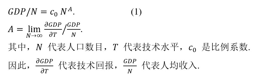 方程(1)是一个非常干净的结果。它显示超线性增长源于指数A,而A等于“技术回报/人均收入”。值得注意的是,在我的理论中,方程(1)只有在人口数量非常大的时候才成立,这也是群体智能涌现的特点——量变引发质变。