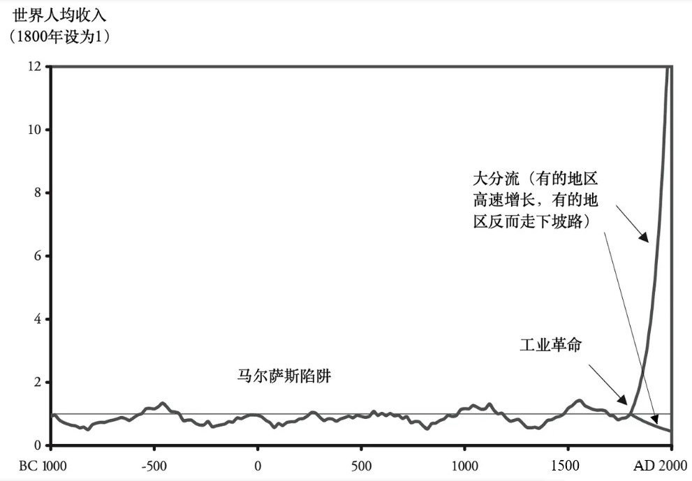 从这幅图可以很清晰的看到,自公元前1000年到公元19世纪初的近3000年岁月里,整个人类社会的人均收入都徘徊在一个非常低的水平附近。18世纪时,英国经济学家马尔萨斯首先注意到这个现象,此后这个现象被学界称作“马尔萨斯陷阱”。马尔萨斯认为人口指数级增长,而生活物资线性增长,不可避免地要导致饥饿、战争和疾病,所以人均收入总是在人口的增长与抑制中被维持在一个低的水平。