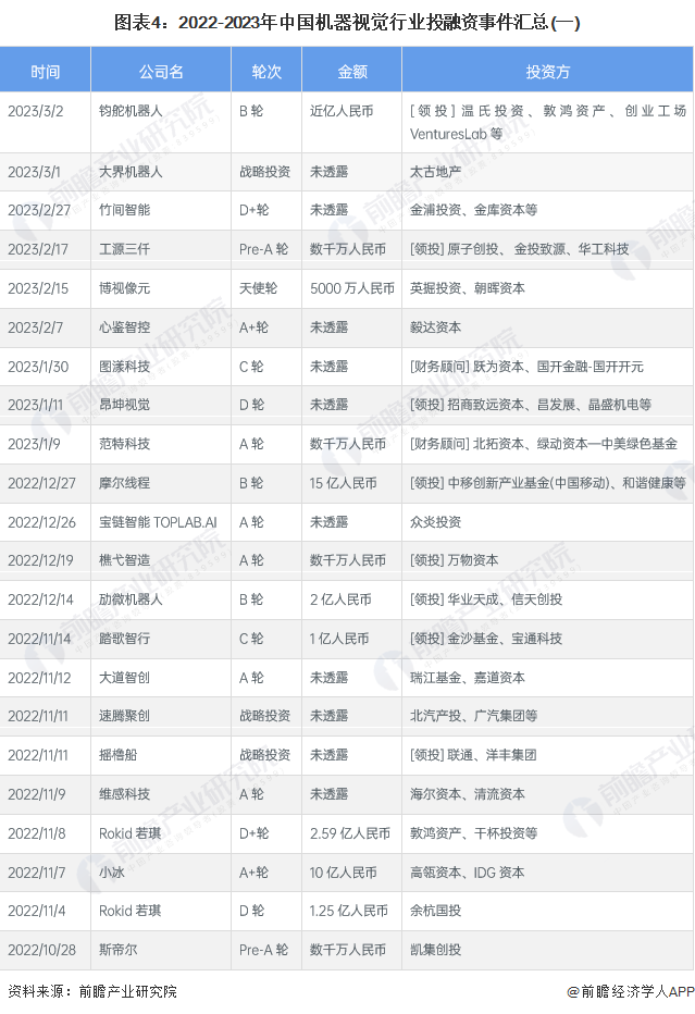从2022-2023年中国机器视觉投融资事件的投资主体来看,投资类机构是我国机器视觉行业主要的投资主体。其中,75%以上的投资事件完全由投资机构主导,主要投资机构有高瓴资本、IDG资本、招商局资本等;其次为投资类机构和实业类企业共同对外投资,占比达15%;纯实业类公司投资机器视觉企业的事件较少,仅有4%,实业类企业有华工科技、OPPO、广汽集团、中国联通等。