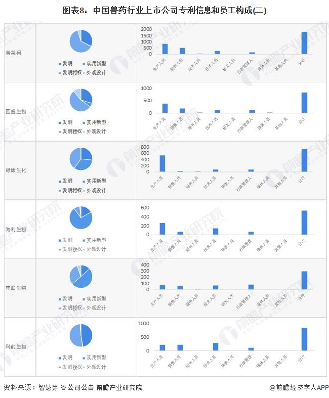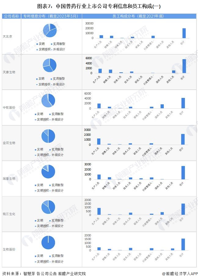 整理兽药行业上市公司已有的公开信息,持有专利数最多的是大北农,截至2023年3月共有924项专利,其中使用新型和发明授权分别为393和328项。同时,大北农的员工总数同样在业内最多,截至2021年年底已超过2万人。