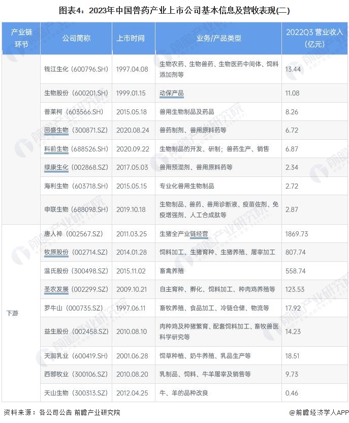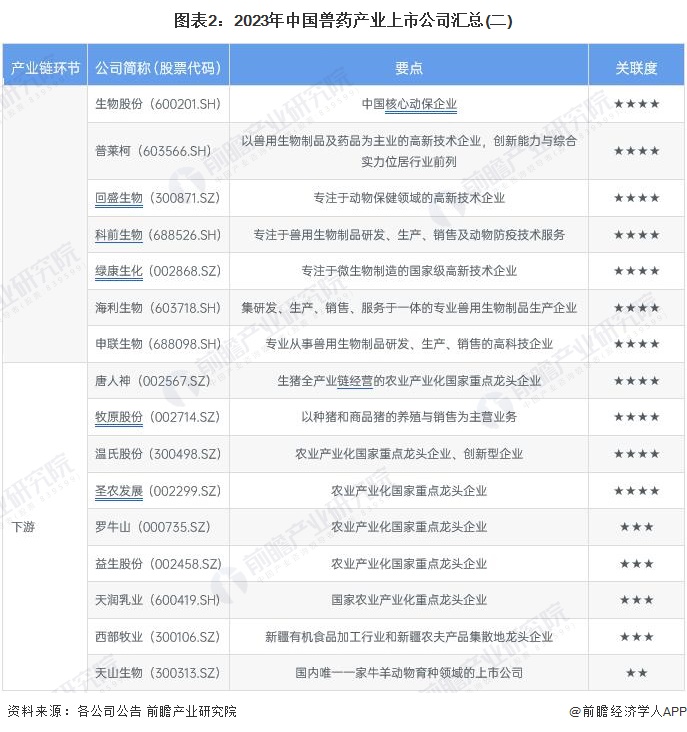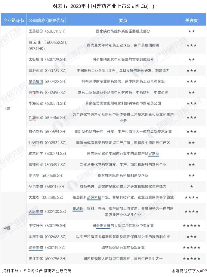 目前,我国兽药企业上市公司分布于上中下游各个环节。产业链上游涉及化学原料药、农副产品加工行业,主要包括白云山(600332)、信邦制药(002390)、昆药集团(600422)等;中游为兽药行业,细分行业包括生物制品兽药、原料药及化学制剂及中药兽药,主要上市公司有瑞普生物(300119)、金河生物(002688)、绿康生化(002868)等兽药企业;下游主要为养禽业、养猪业、牛羊养殖业等,上市公司主要包括圣农发展(002299)、唐人神(002567)、西部牧业(300106)等。